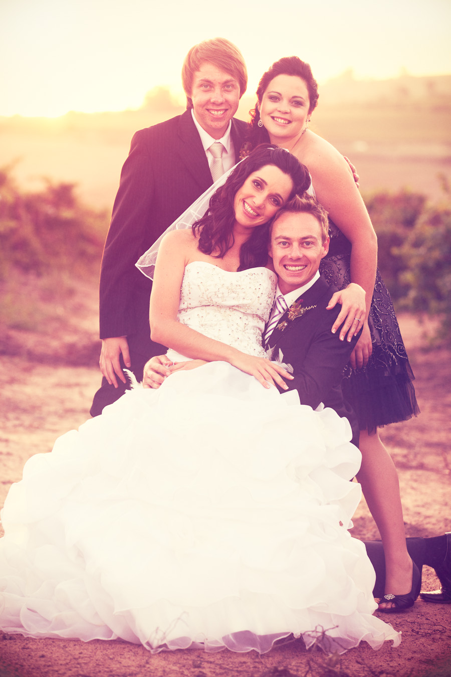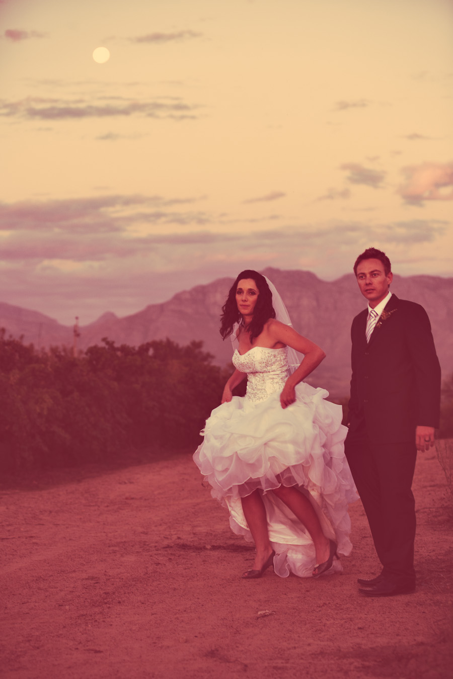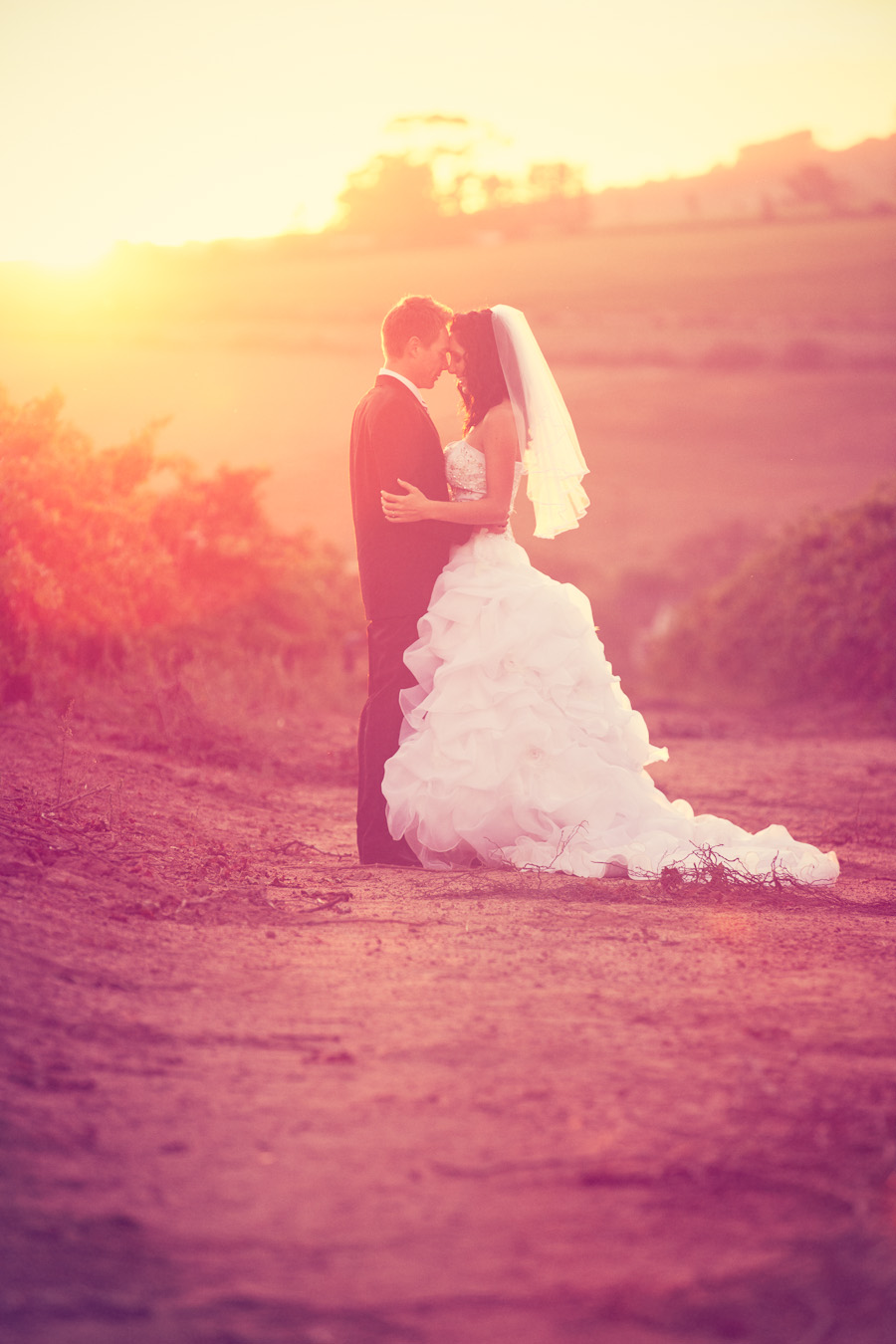 Late afternoon on a wine farm, looking out on a spectacularly warm glowing sunset with a view of autumn coloured vineyards leading to the hazy pink Helderberg Mountains. This feeling of warmth, love and friendship is surely what we all want on our wedding day, and that exactly whats Willie and Leza got on their perfect day at Skilpadvlei, just outside Stellenbosch, the capital of the winelands district in Western Cape.
